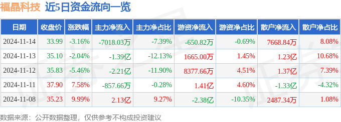 股票行情快报:福晶科技(002222)11月14日主力资金净卖出7018.03万元